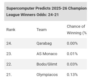 Turkish giants Galatasaray sit marginally above Olympiacos with a 0.14% chance of lifting the trophy. Powered by the lethal Victor Osimhen, the Nigerian striker’s goals carried them to a 20th-place finish in the league phase and into the playoffs. While expectations remain modest, their attacking threat makes them a dangerous opponent.