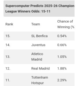 Juventus sit just above them in 14th, rated at 0.66%. The Italian giants faced a demanding set of fixtures, including away trips to Real Madrid and Monaco, and home clashes against Dortmund, Sporting and Benfica. Recent improvements in form suggest they could be a threat if momentum builds.