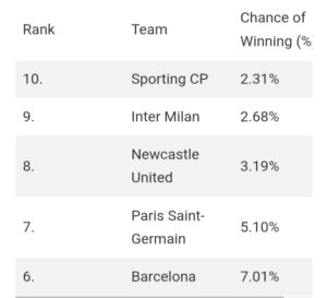Inter Milan, last season’s finalists, remain firmly in contention, while Newcastle United are handed a 3.19% chance — notably higher than several established European heavyweights — despite missing out on automatic qualification.